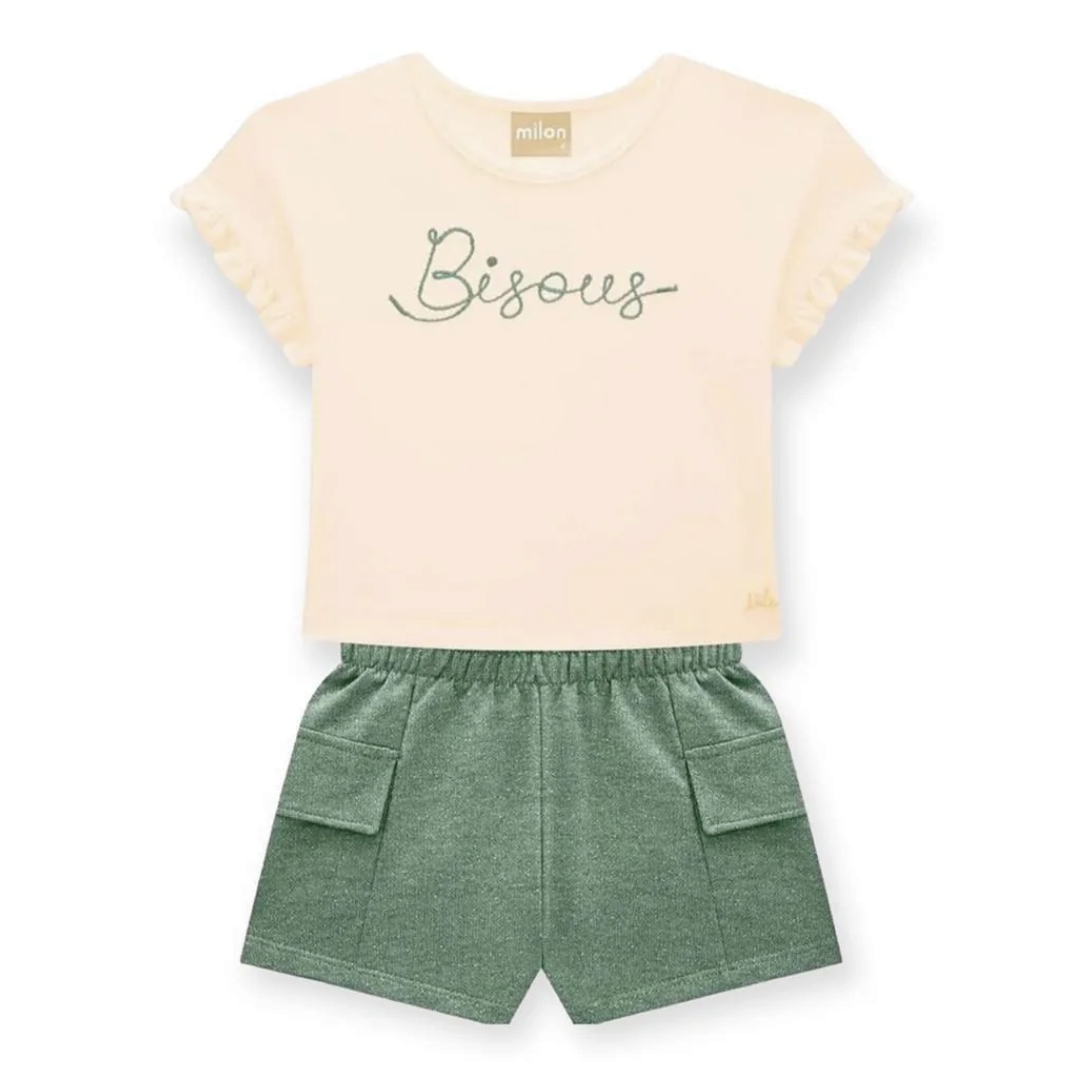 El conjunto de blusa beige y short verde para niña es una opción vibrante y divertida.