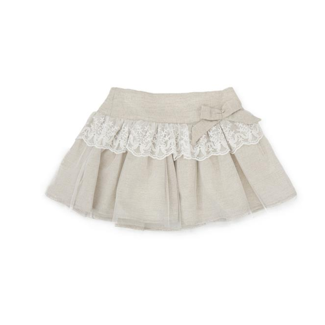 Falda beige con diseño de encaje y decoración de lazo.