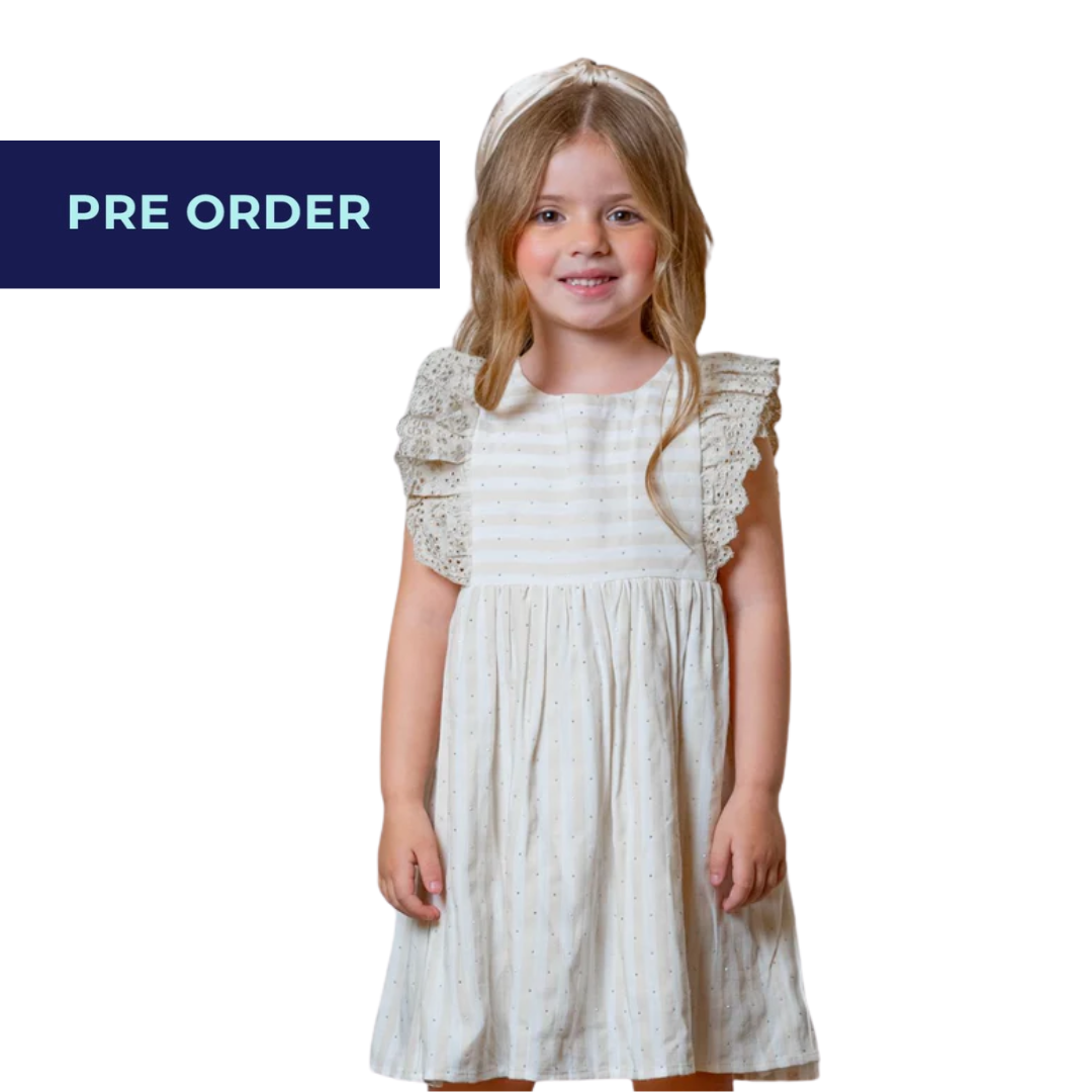 Vestido beige de niña con destellos es la elección perfecta para crear un look radiante y sofisticado. Los destellos añaden glamour y una pizca de brillo, mientras que el color beige mantiene la elegancia y la suavidad del conjunto.