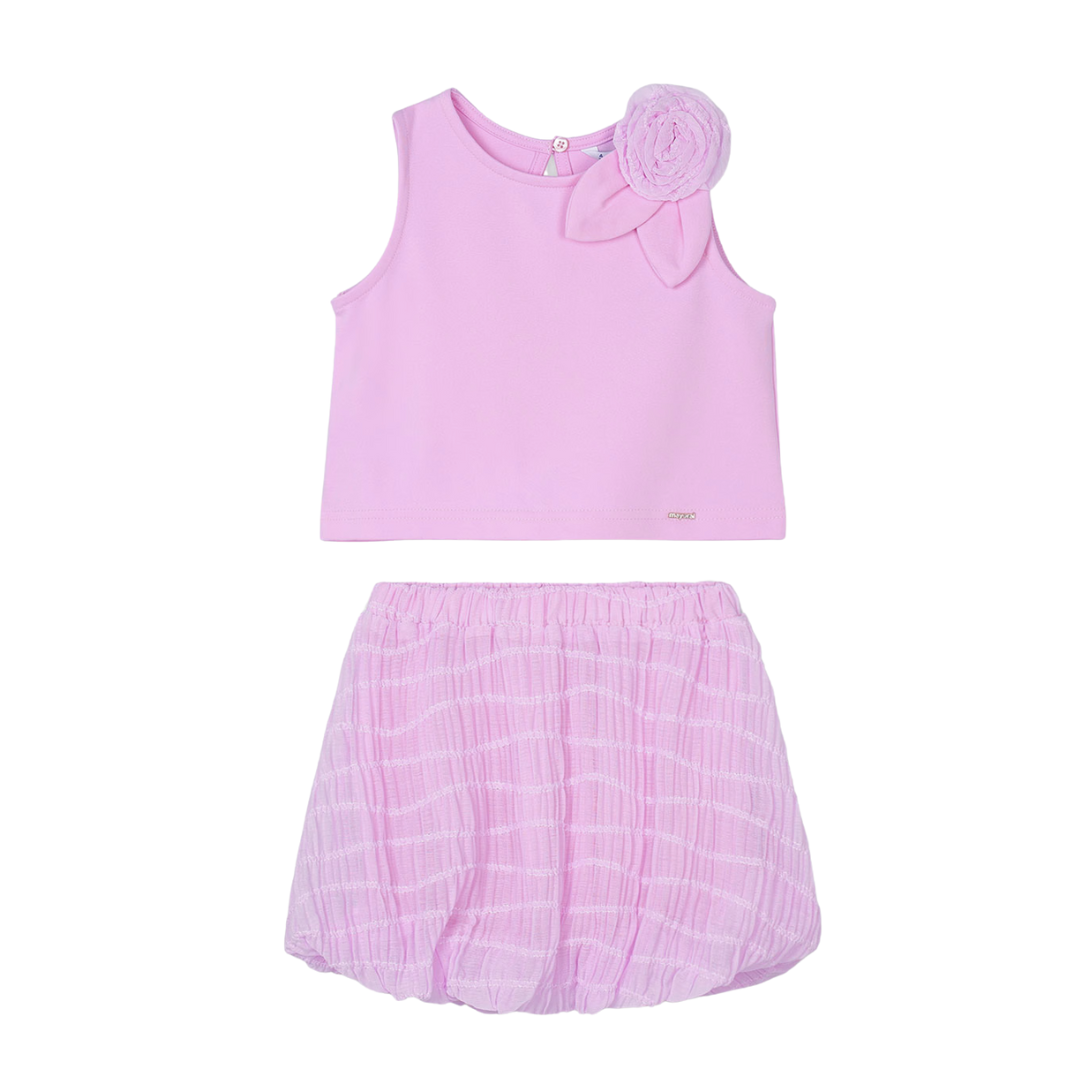 El conjunto falda globo y top es una elección versátil y encantadora para el vestuario infantil.