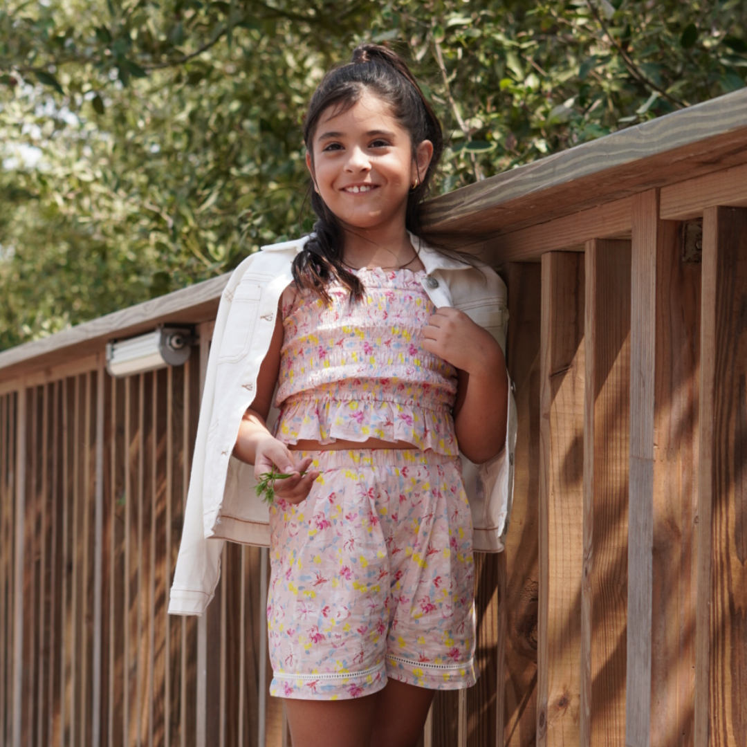 Conjunto para niña es una opción encantadora y alegre, ideal para darle un toque fresco y colorido a su vestuario. Este set esta compuesto blusa y short floral ideal para que la niña se vea adorable y cómoda.
