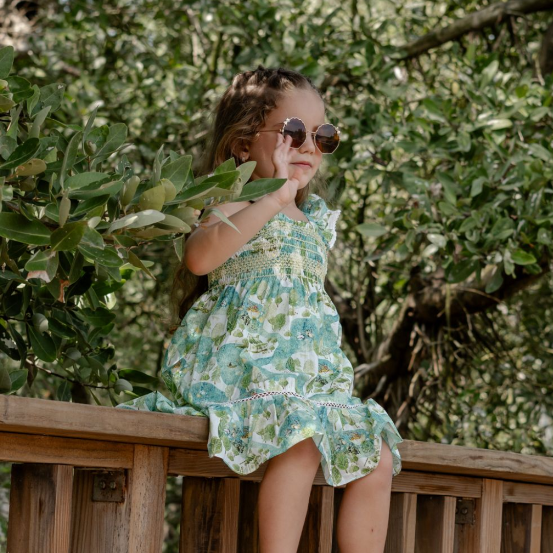 Adorable vestido verde para niña, diseñado con tirantes finos que aportan frescura y comodidad.