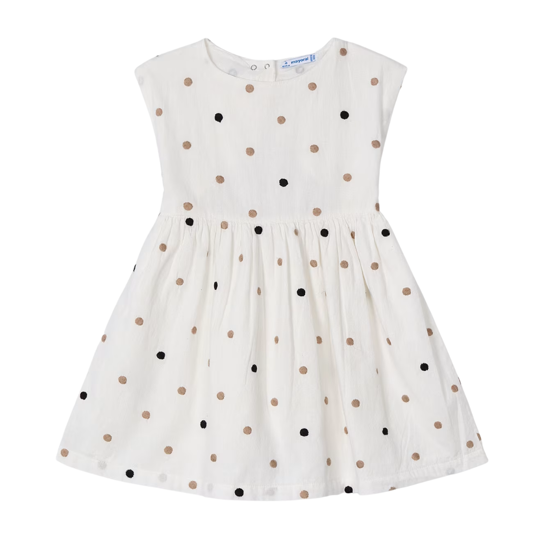 Vestido blanco de puntos es una prenda ligera y alegre, ideal para ocasiones especiales como bautizos, cumpleaños o eventos informales.