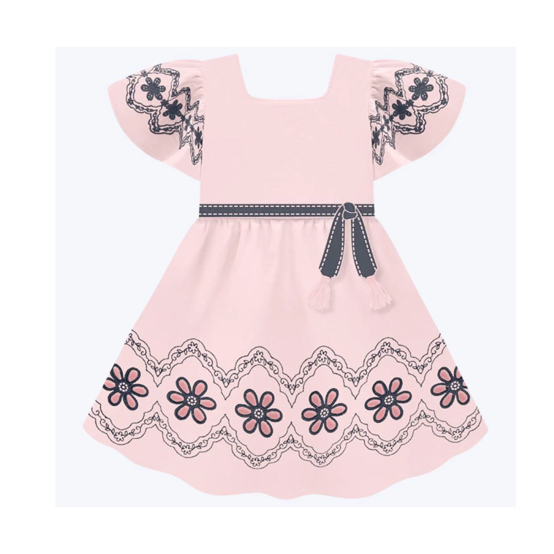 Vestido de niña rosado con detalle florales en las mangas y en el parte inferior del vestido. Dándole un look fresco, ideal para toda ocasión.