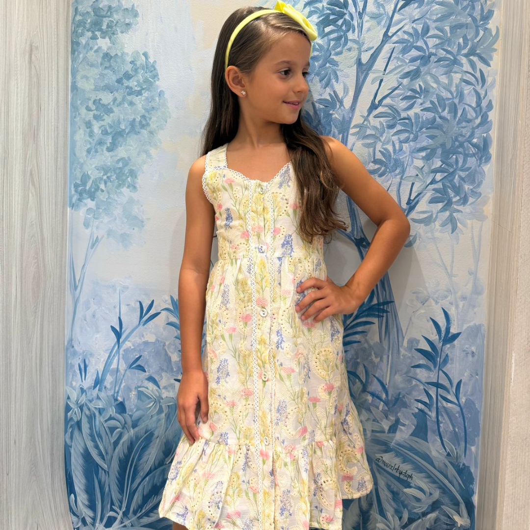 Adorable vestido en tonos amarillos para niña, diseñado con tirantes finos que aportan frescura y comodidad.
