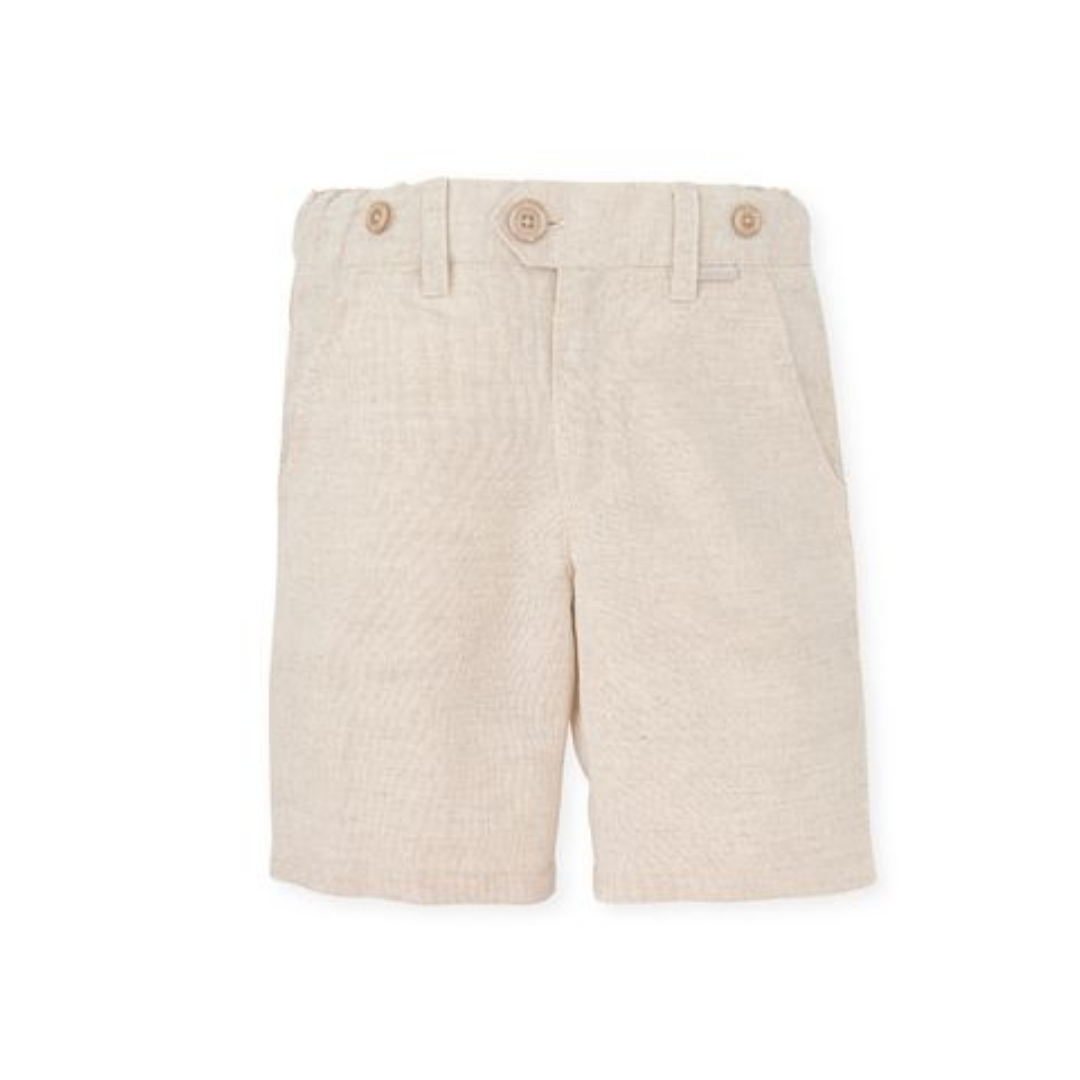 Bermuda khaki de niño confeccionada en lino, un tejido fresco y ligero ideal para el clima cálido. Su diseño clásico y cómodo ofrece un estilo versátil, perfecto para ocasiones casuales o más formales.