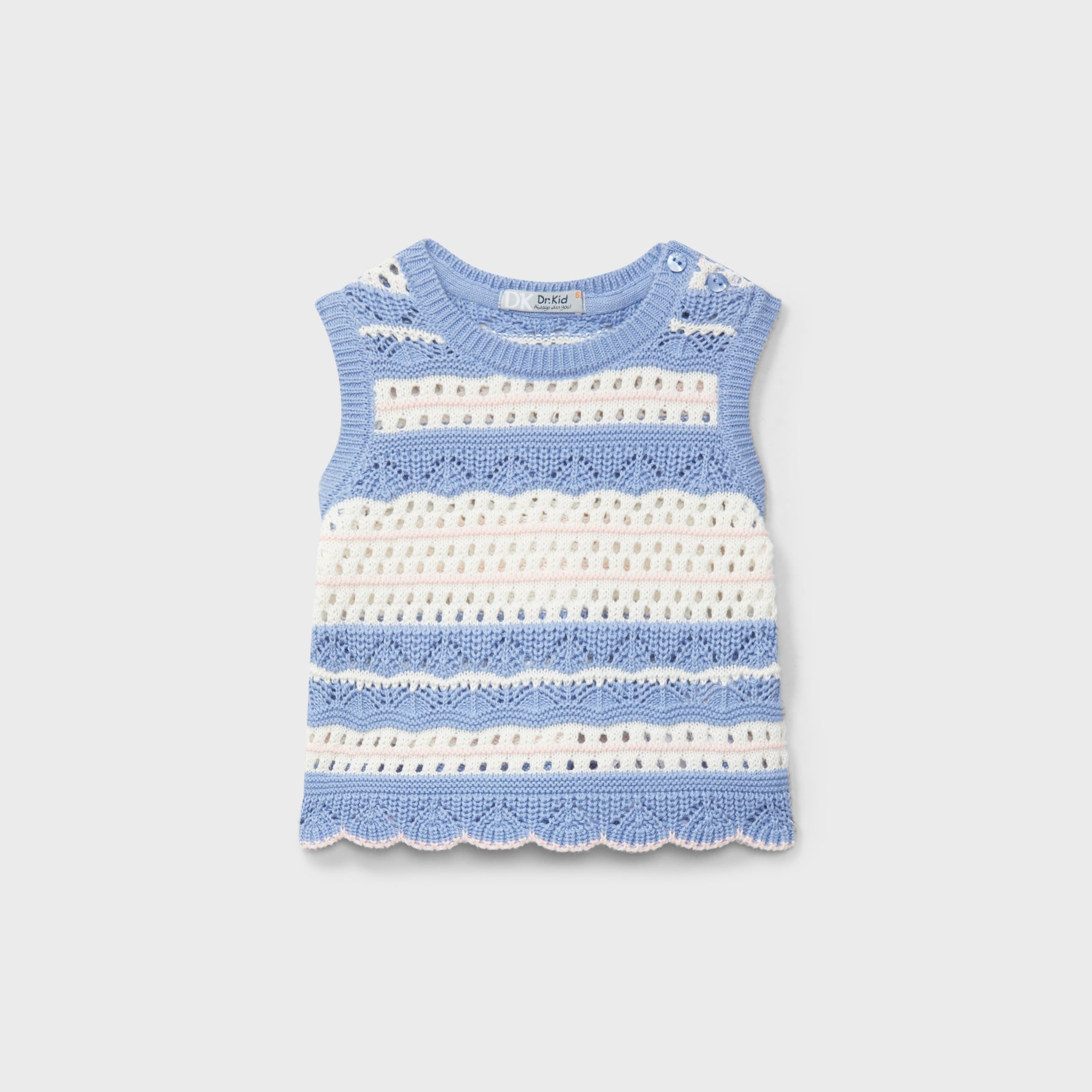 Blusa de niña tejida en crochet, elaborada en hilo azul con delicado diseño calado que resalta su estilo artesanal. De textura suave y ligera, perfecta para días cálidos. Su confección detallada aporta un toque encantador y fresco, ideal para combinar con faldas o shorts en looks veraniegos.