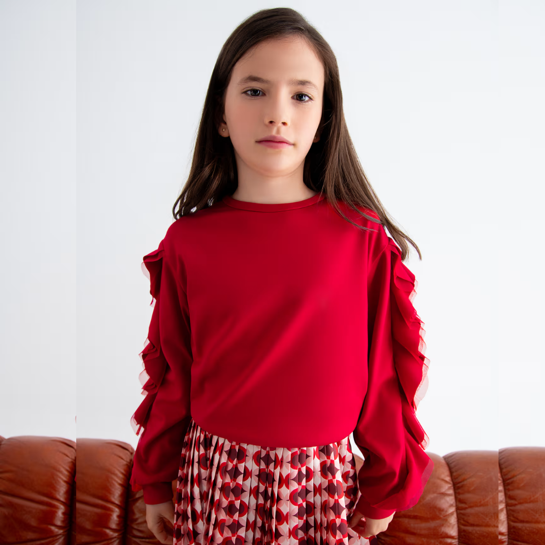 Buzo rojo de niña manga larga en tejido suave que abriga; color rojo vibrante; cuello redondo; puños y cintura ajustados para mayor comodidad; corte cómodo, ideal para combinar con pantalones o faldas y uso diario.