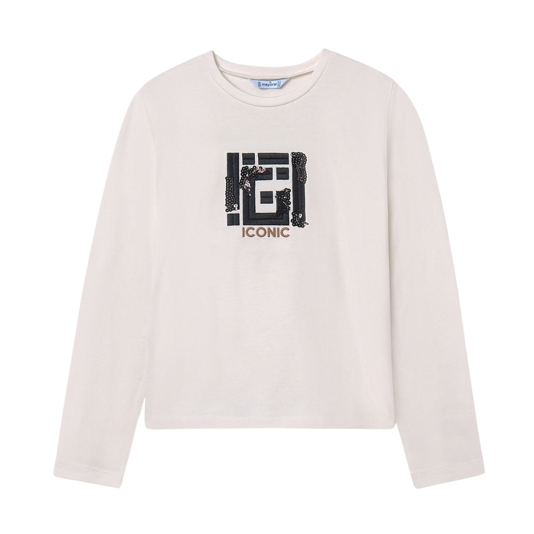 Buzo blanco, Cuello redondo. Suave tejido de algodón elástico. Elementos de adorno: lentejuelas.