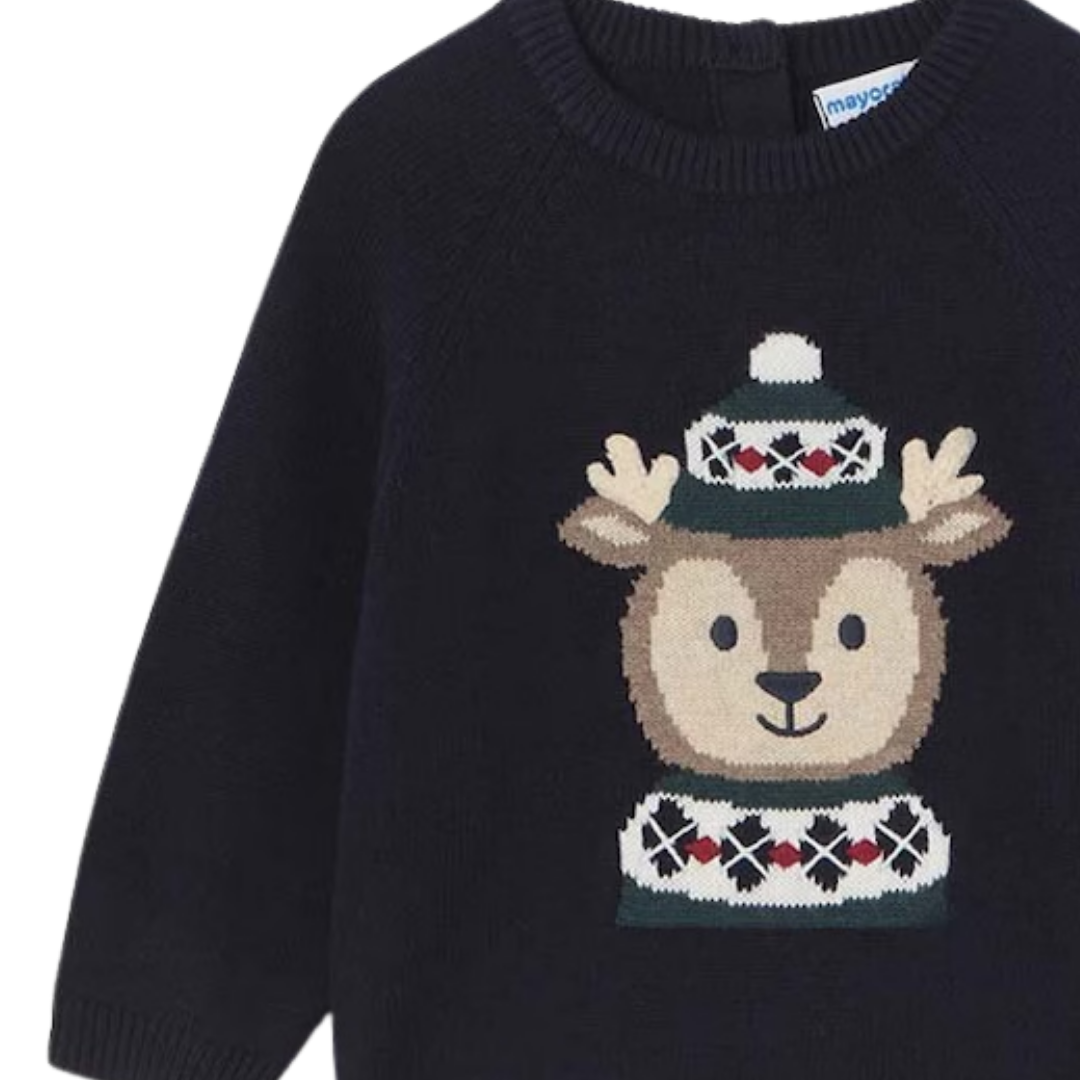 Buzo unisex en tono navy con un encantador diseño de reno al frente. Confeccionado en tela suave y abrigada, perfecto para la temporada navideña y para lucir un estilo festivo y cómodo.