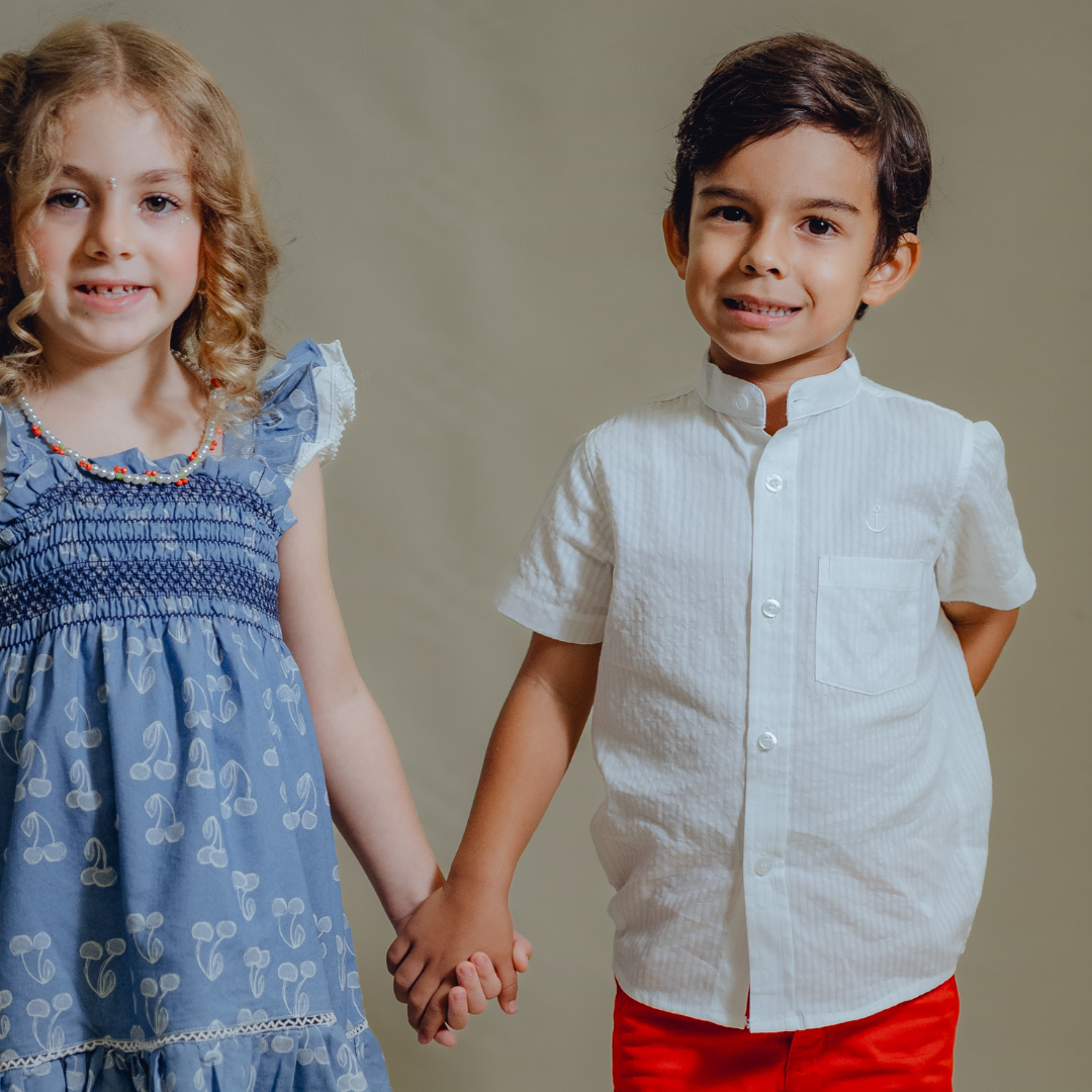 Camisa blanca de niño con cuello Neru, de manga larga y corte recto. Confeccionada en algodón suave, ideal para ocasiones formales o casuales. Diseño moderno y cómodo, con botones frontales y estilo minimalista.