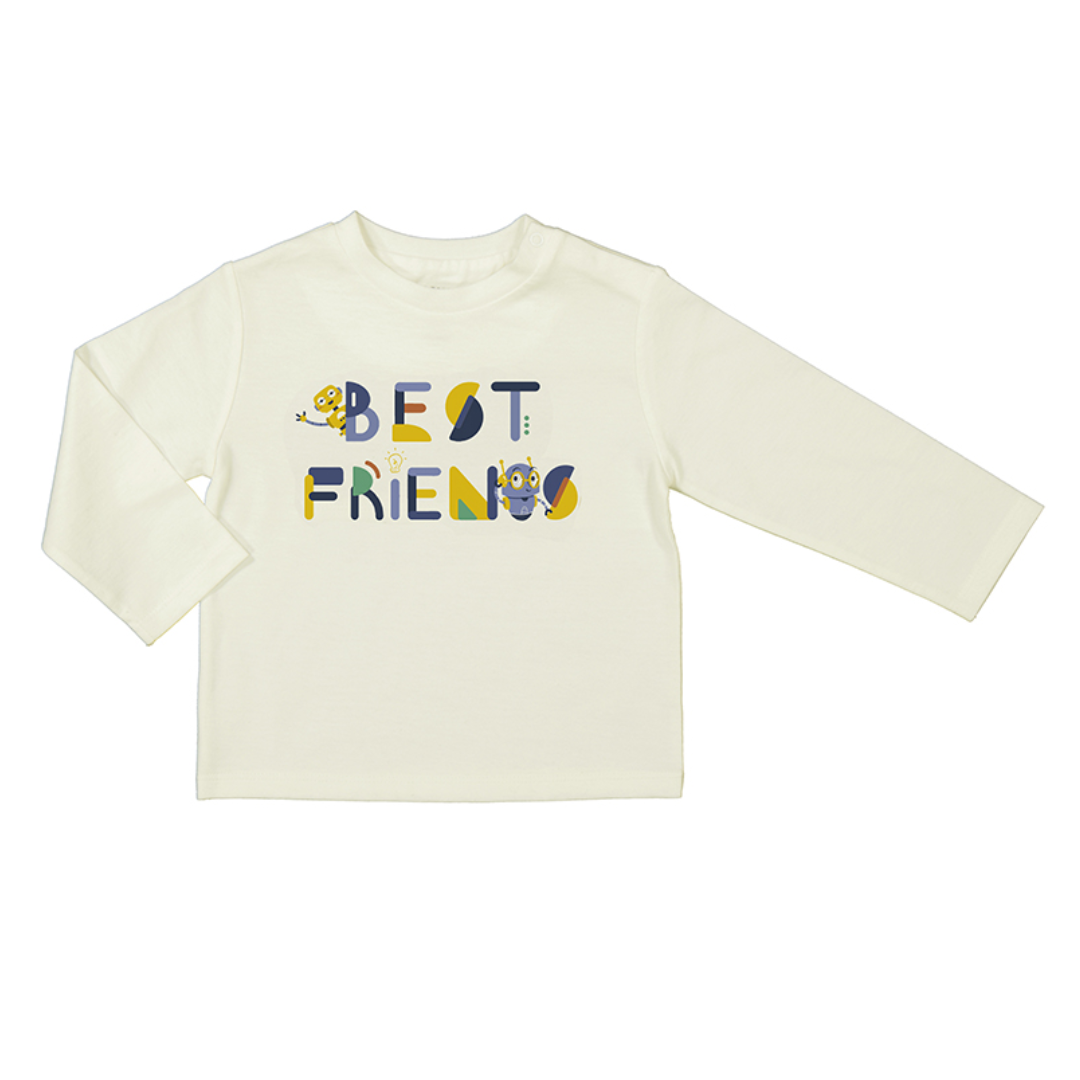 Buzo blanco de niño con diseño en letras divertidas y con fit generalmente relajado, permitiendo libertad de movimiento para jugar y explorar. Además, Mayoral se destaca por su calidad, asegurando que el buzo sea duradero y fácil de cuidar, lo que lo convierte en una excelente opción para cualquier guardarropa infantil.