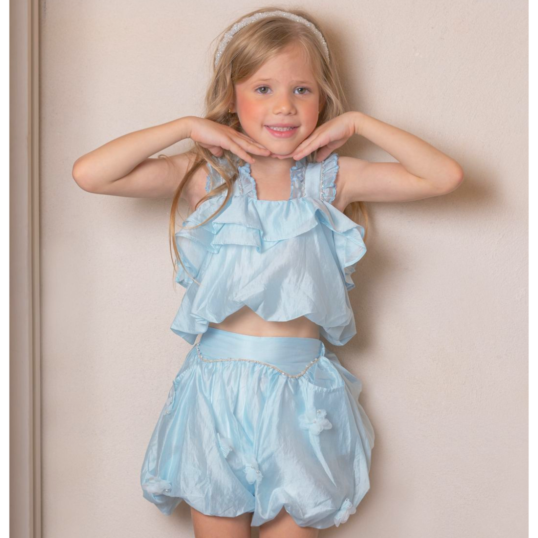 Un conjunto de niña compuesto por falda y blusa bombacho es una opción encantadora y fresca para cualquier ocasión.