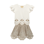 Conjunto beige de niña, cómodo y delicado, ideal para cualquier ocasión con un toque de elegancia.