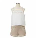 Un conjunto infantil de dos piezas: una blusa blanca con bordados beige y un short beige con detalles bordados a juego, de estilo fresco y elegante.