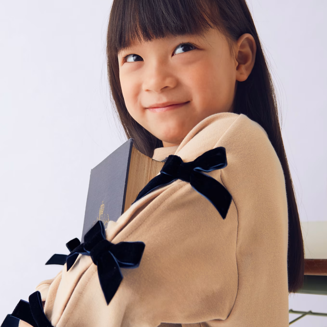 Sudadera de manga larga para niña. Cuello redondo. Elementos de adorno: detalles fruncidos, apliques de lazos.