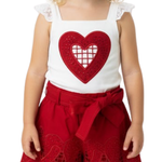 Conjunto para niña blusa blanca con un corazón al frente y un short rojo a juego. La blusa es ligera y cómoda, mientras que el short ofrece un ajuste suave y práctico para el uso diario.