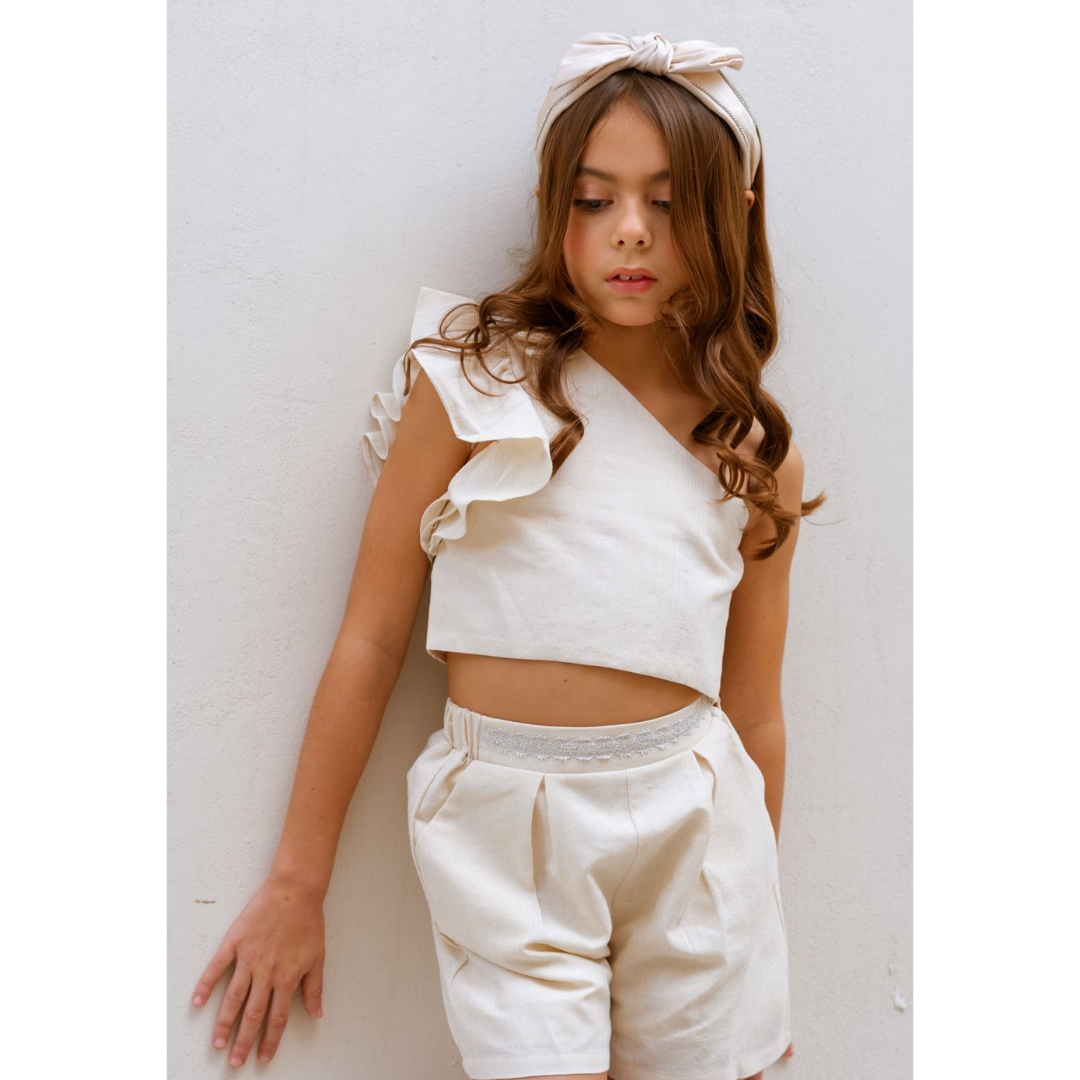 Conjunto de niña compuesto por short y blusa de un solo hombro es una opción moderna y fresca, ideal para el verano o climas cálidos. Este tipo de conjunto combina comodidad con un toque de estilo elegante y divertido.