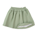 Falda para niña en tono verde, confeccionada en tela suave y ligera. Presenta un diseño cómodo con pretina ajustable y caída con movimiento. Ideal para combinar con blusas o camisetas, ofreciendo un look fresco y alegre.