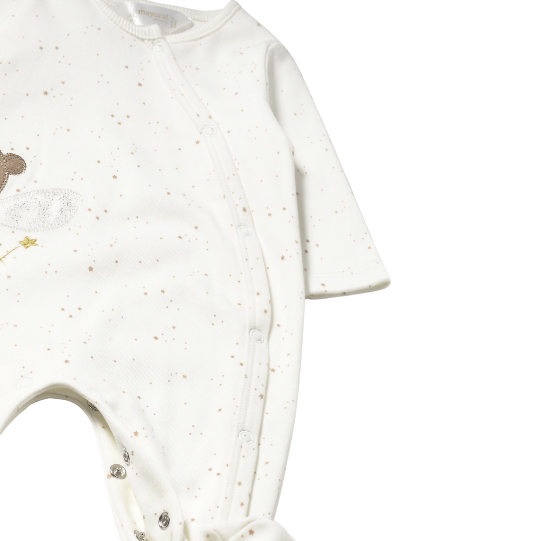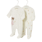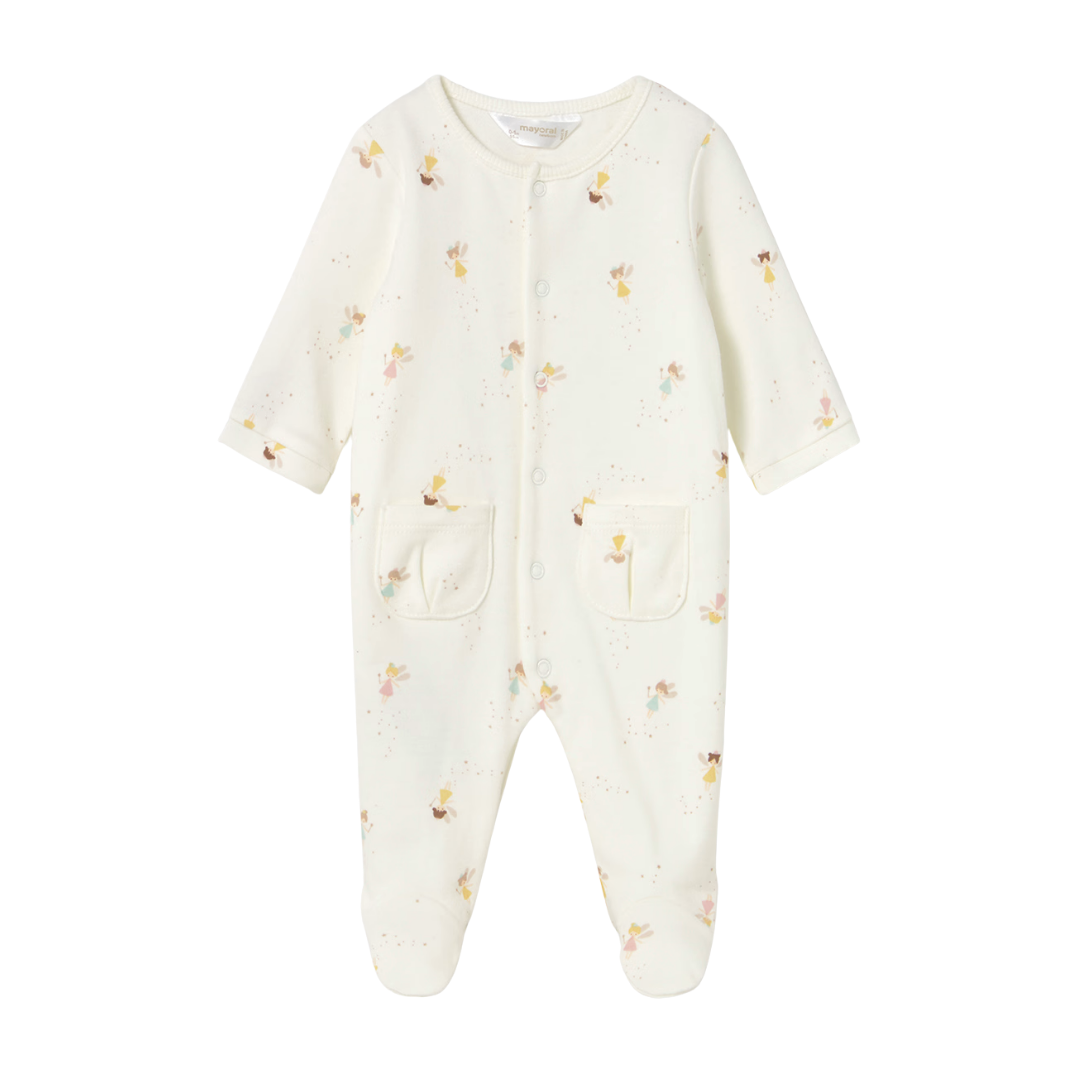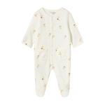 Pijama de manga larga para recién nacido. Cuello redondo. Cierre con botones a presión en la parte delantera. Botones a presión en la entrepierna para facilitar la puesta de la prenda. Diseño estampado.