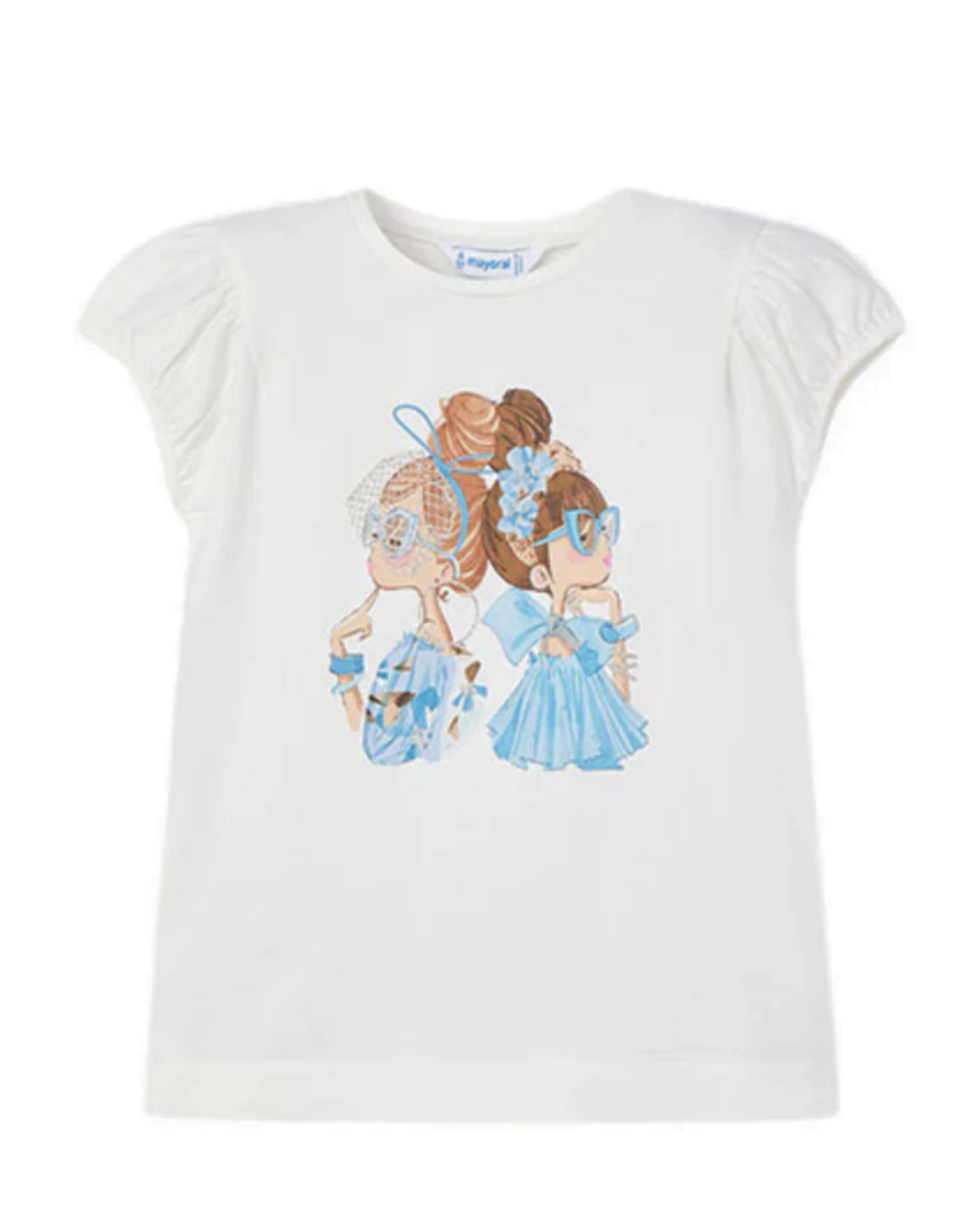 Blusa de niña en tonos blanco/ azul con diseños sutiles ideal para añadir un toque de color suave y femenino al armario de tu pequeña!