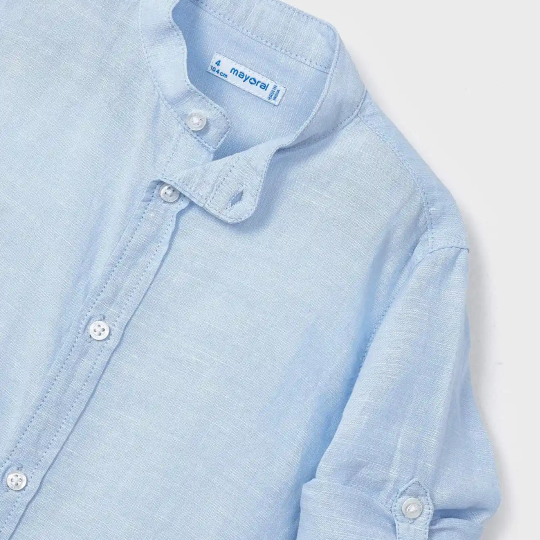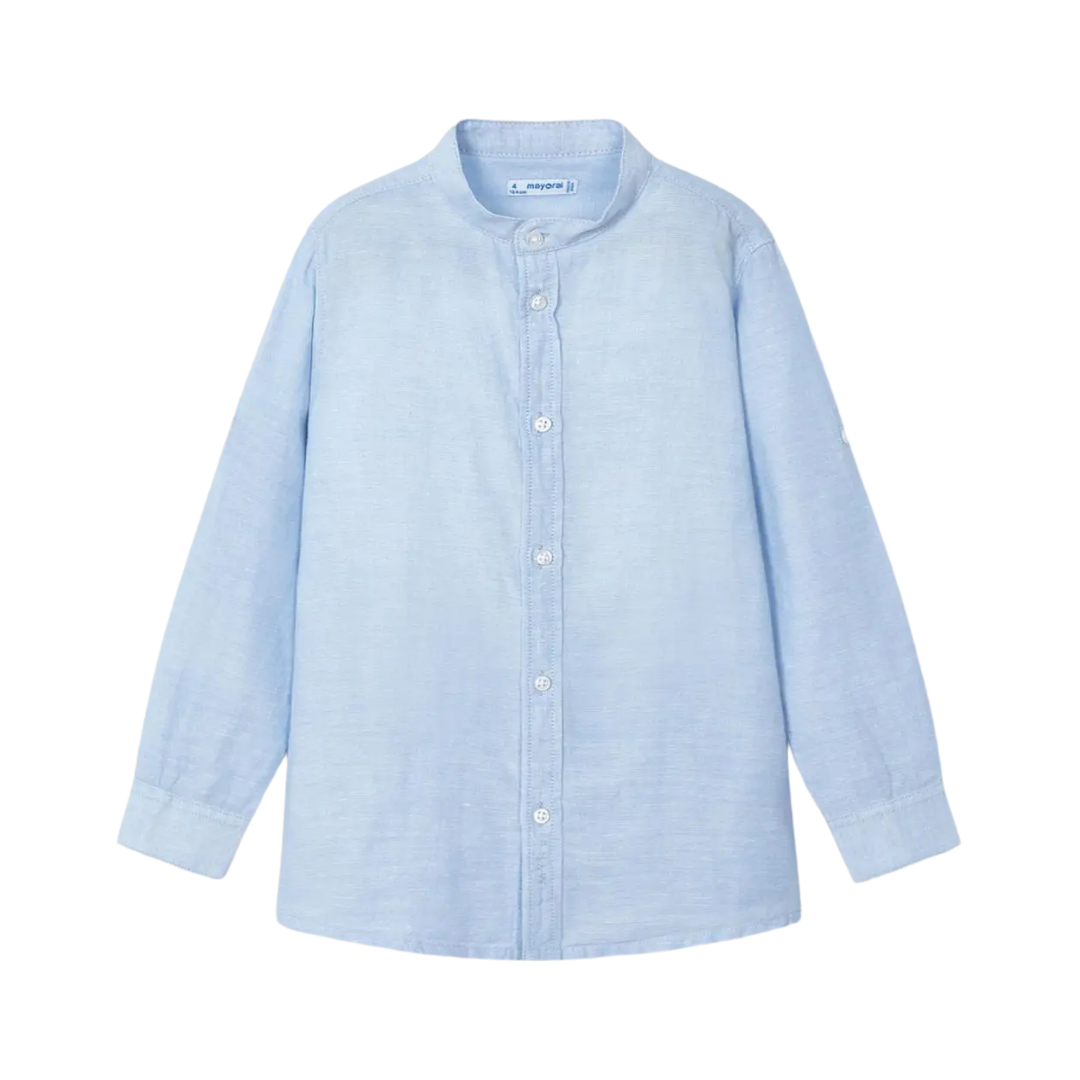 Camisa manga larga caleste que aporta un toque de elegancia y versatilidad a cualquier atuendo.