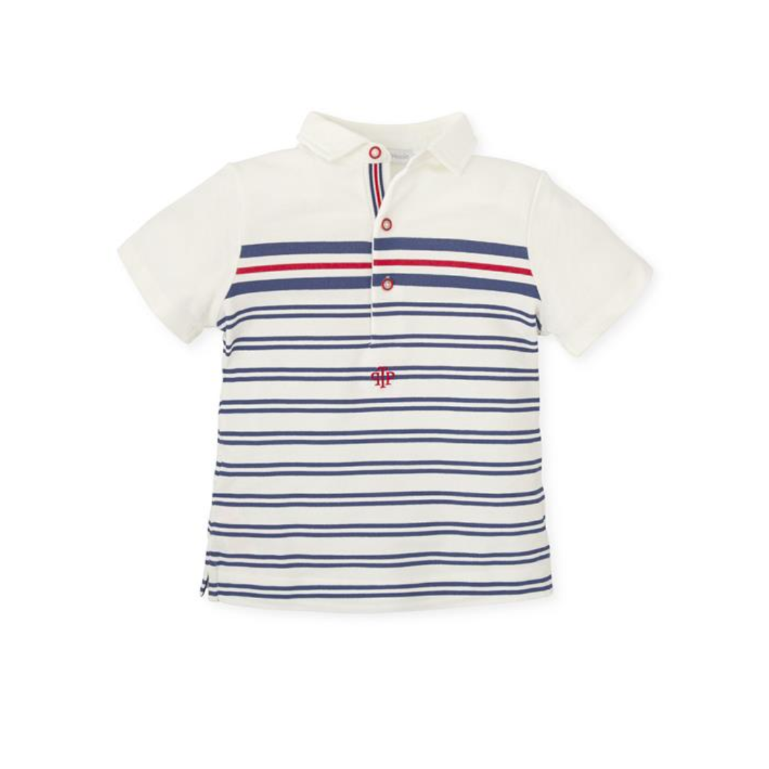 Camisa manga corta de bebé con detalle de botones y diseño de rayas en tonos azul turquí y rojo