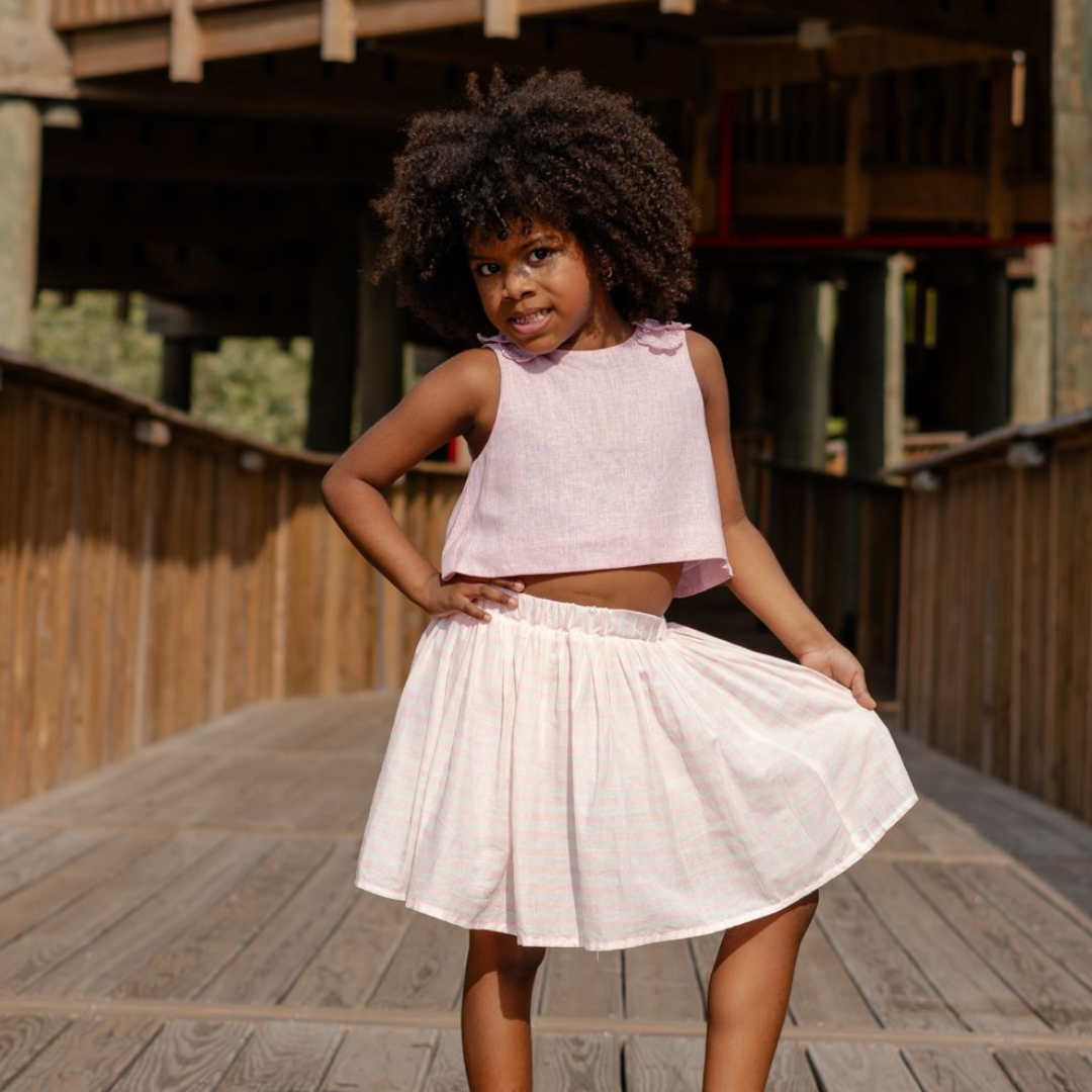 Este conjunto combina la suavidad y frescura de la blusa con la versatilidad y estilo de la falda, creando un look equilibrado y femenino.
