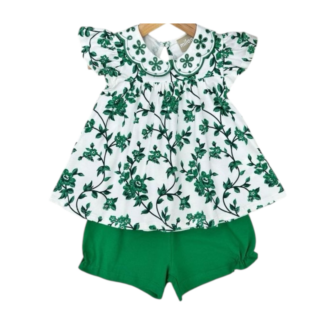 Conjunto de niña blanco verde muy bonita y versátil. con diseño de flores verde perfecto para toda ocasión.
