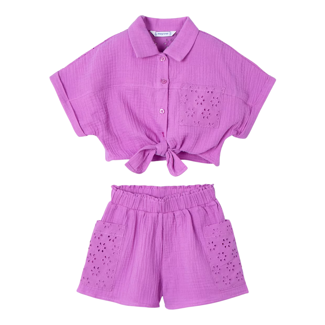 Conjunto de niña en color morado compuesto por short y blusa es una opción cómoda, fresca y versátil, ideal para el día a día o actividades informales, manteniendo un estilo relajado y moderno.