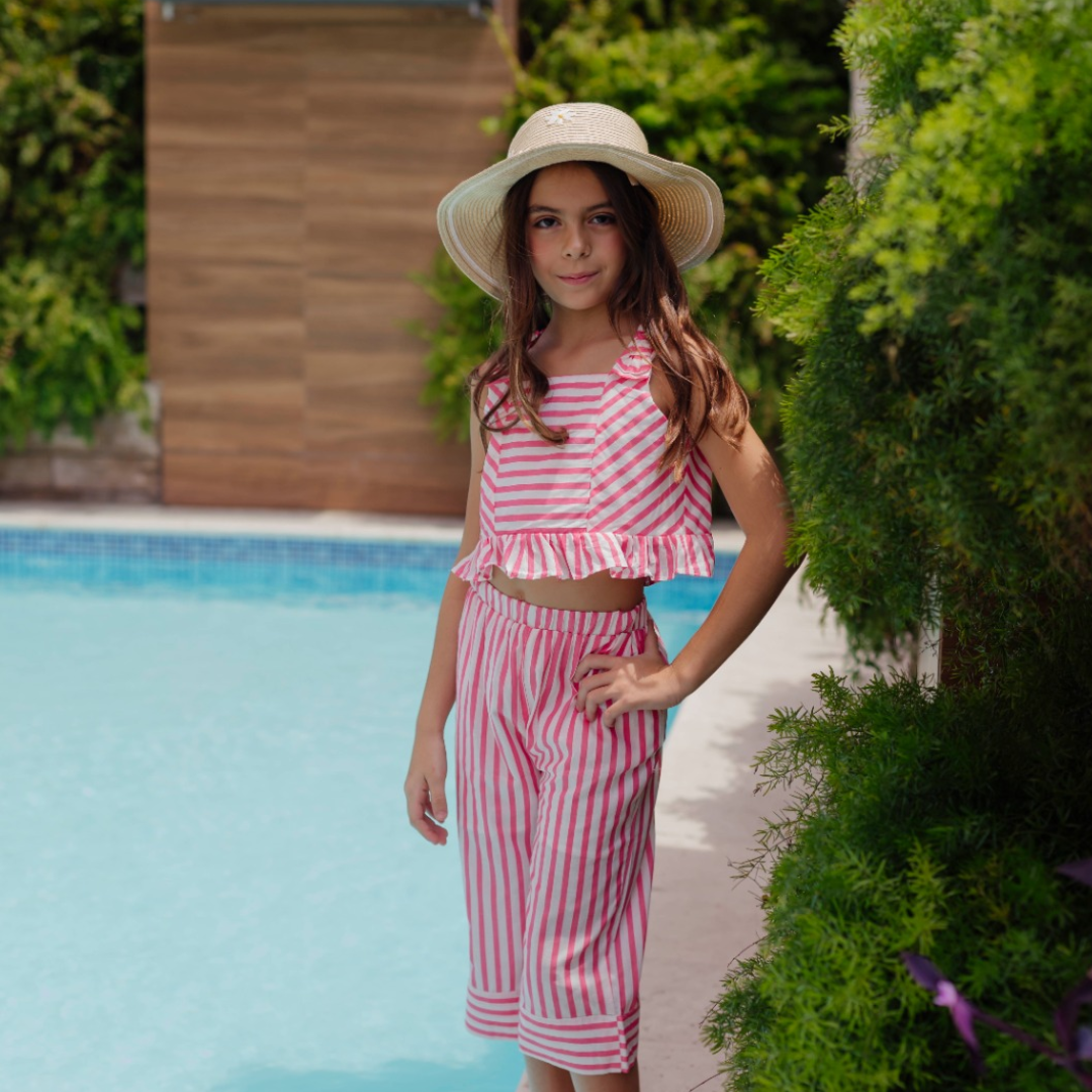 Este conjunto combina la suavidad y frescura de la blusa con la versatilidad, creando un look equilibrado y femenino.
