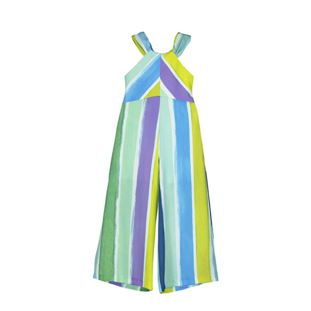 Enterizo Verano Multicolor con cremallera invisible trasera para niña. Especial para vacaciones inolvidables, cómodo, fresco y práctico para las más pequeñas de la casa. Perfecto para ocasiones especiales al aire libre. Este enterizo tiene colores que reflejan los colores del mar y sus tonalidads azules verdosas, gracias a su estampado azulado genera sensación de mucha frescura.