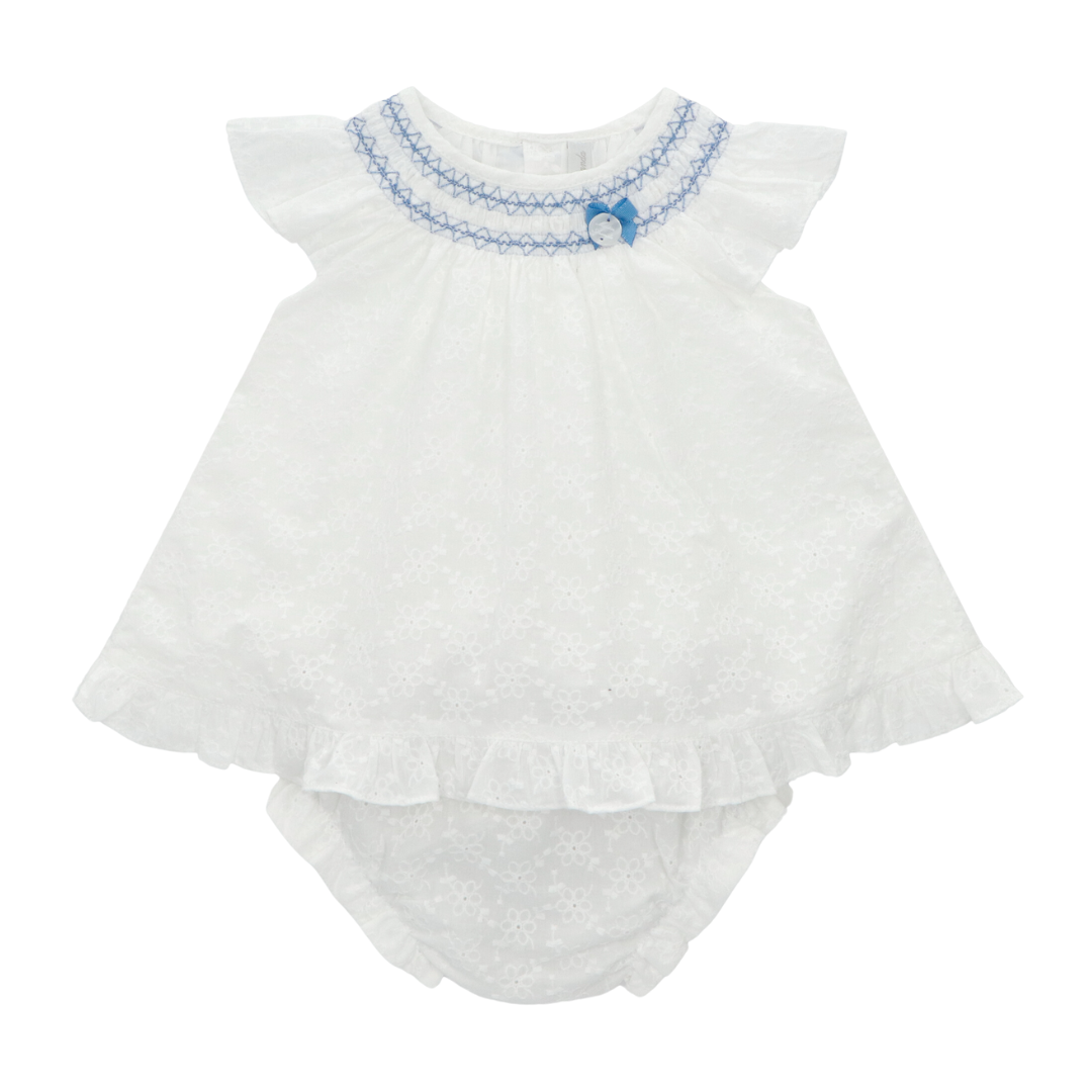 Vestido para niña bebé en tono blanco con detalles azules, acompañado de un cubre pañal, es una opción encantadora y práctica para las más pequeñas.