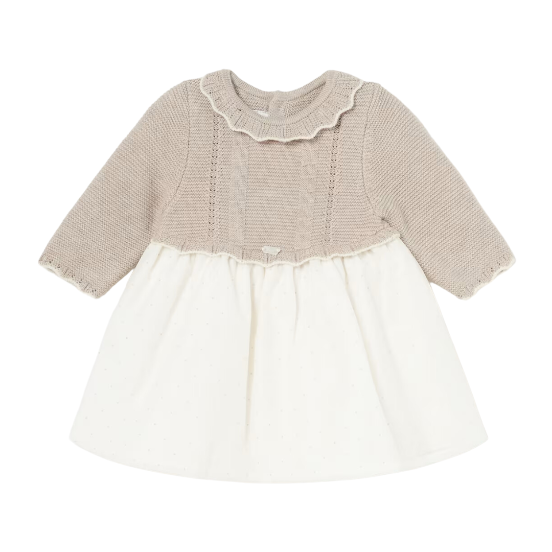 Este encantador vestido para bebé combina la pureza del blanco con el suave tono khaki, creando un look dulce y moderno. La parte superior es de un delicado tejido khaki.