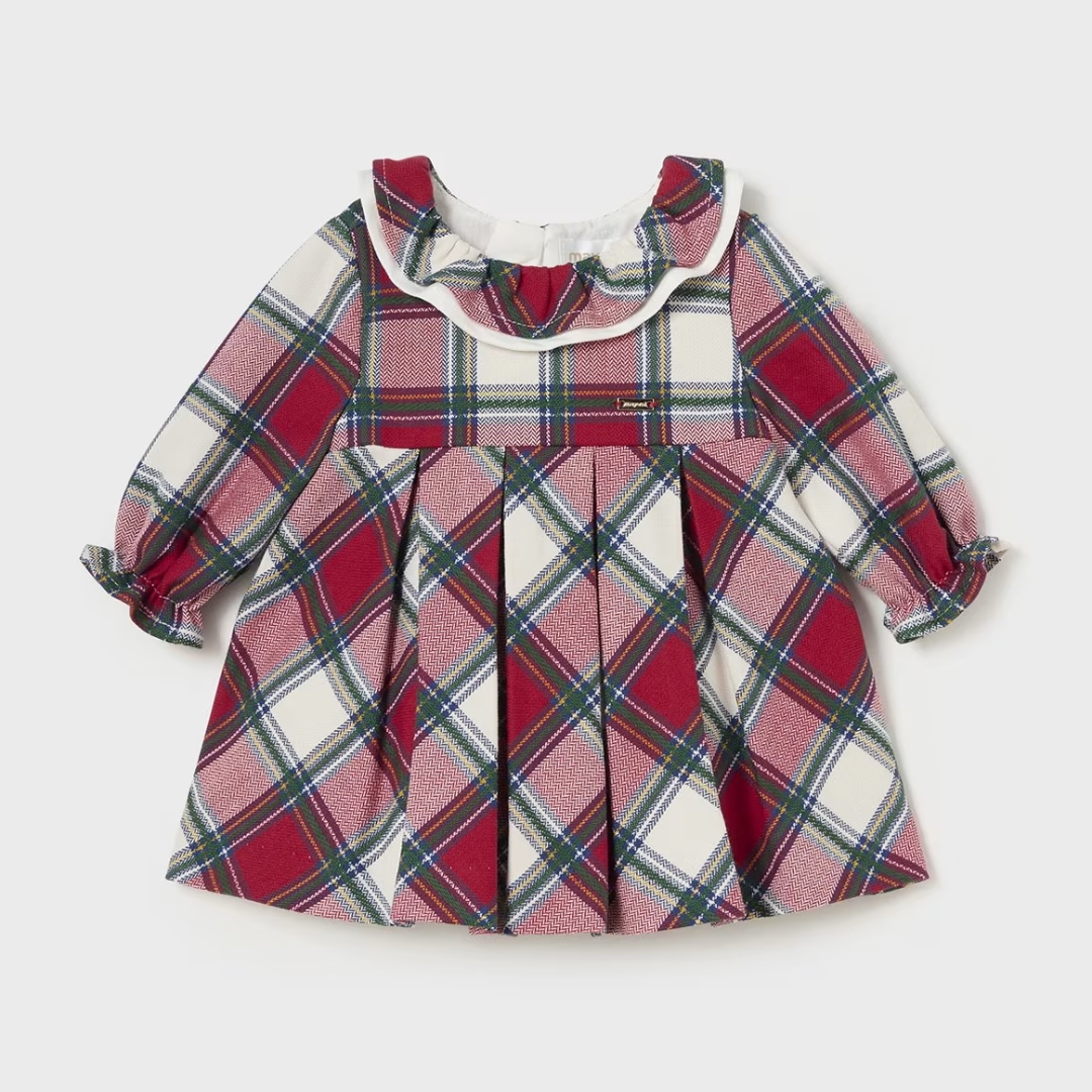 Vestido para bebé niña con diseño de cuadro en tono rojo con cuello.