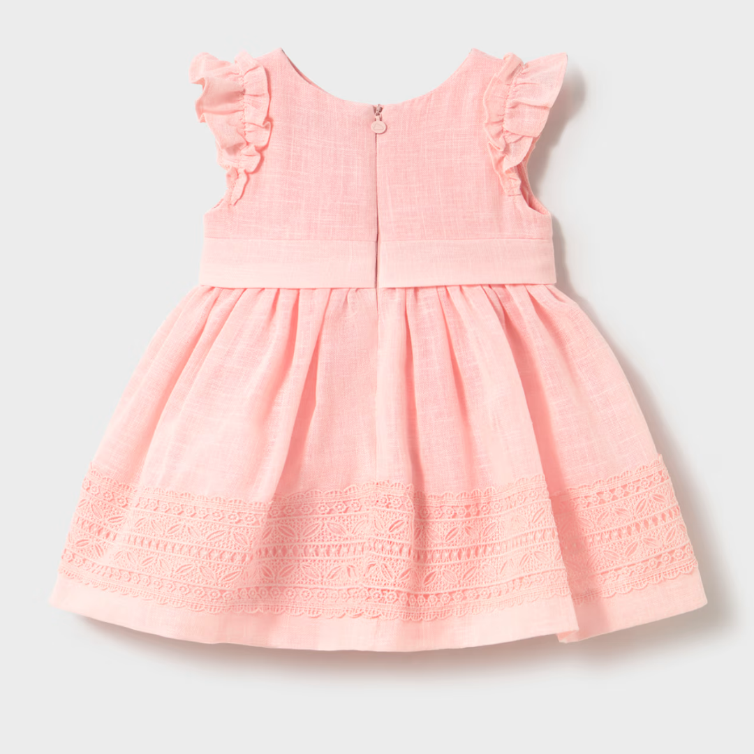 Vestido infantil con mangas cortas tipo vuelo y falda amplia con delicado encaje en el ruedo. En la cintura tiene pliegues decorativos y un pequeño detalle de flor en tono suave que aporta un toque dulce y elegante.
