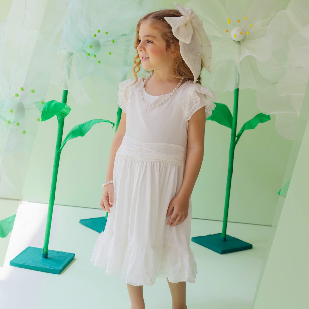 Vestido blanco para niña es elegante y delicado, ideal para ocasiones especiales como bautizos, primeras comuniones o celebraciones formales.