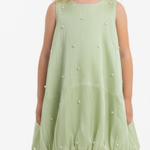 Vestido verde menta para niña, con delicadas perlas aplicadas y bajo abombado que aporta un toque moderno y elegante. Ideal para ocasiones especiales.