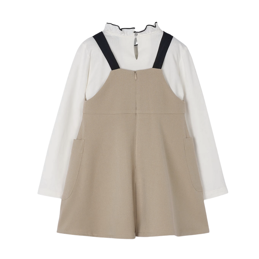 Vestido tipo pichi de tirantes para niña. Cuello recto. Cierre central trasero con cremallera oculta. Modelo con forro interior. Bolsillos funcionales en la parte delantera.