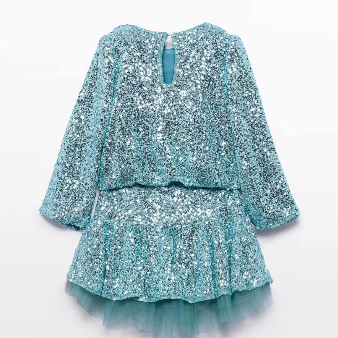 Vestido de niña rosa de lentejuelas, manga larga, con botones en la parte trasera del cuello. Brillante y delicado, ideal para ocasiones especiales.