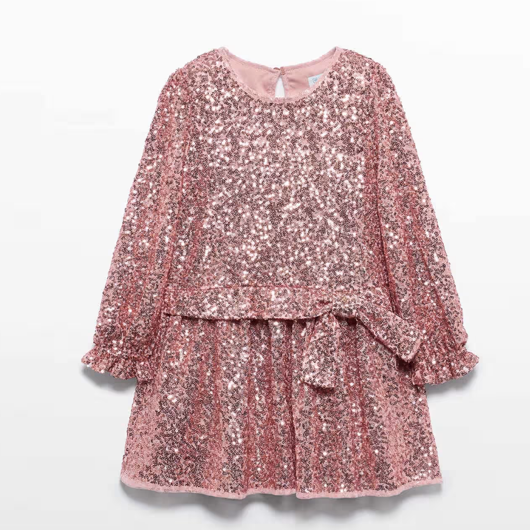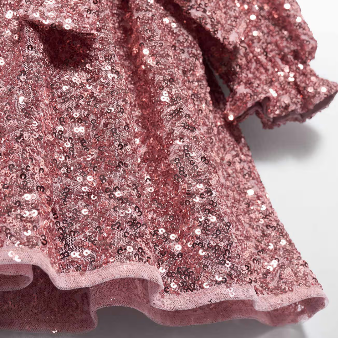 Vestido de niña rosa de lentejuelas, manga larga, con botones en la parte trasera del cuello. Brillante y delicado, ideal para ocasiones especiales.