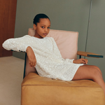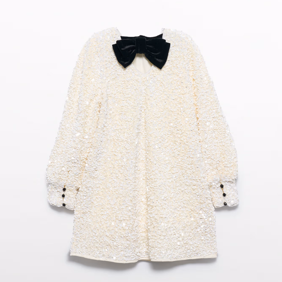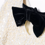 Vestido de niña blanco de lentejuelas, manga larga, con elegante lazo negro en la parte trasera del cuello. Brillante y delicado, ideal para ocasiones especiales.