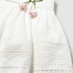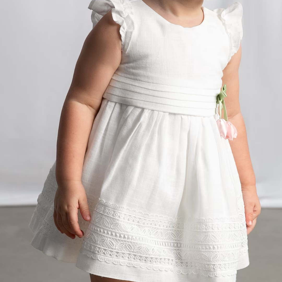 Vestido infantil blanco con mangas cortas tipo vuelo y falda amplia con delicado encaje en el ruedo. En la cintura tiene pliegues decorativos y un pequeño detalle de flor en tono suave que aporta un toque dulce y elegante.