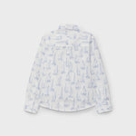 Camisa de manga larga de color blanco con un estampado de pequeños barquitos distribuidos por toda la prenda. Tiene cuello clásico, botones en la parte delantera y puños ajustables. Su diseño es alegre y delicado, con un toque náutico que la hace perfecta para un estilo casual o para ocasiones especiales con un aire marinero.