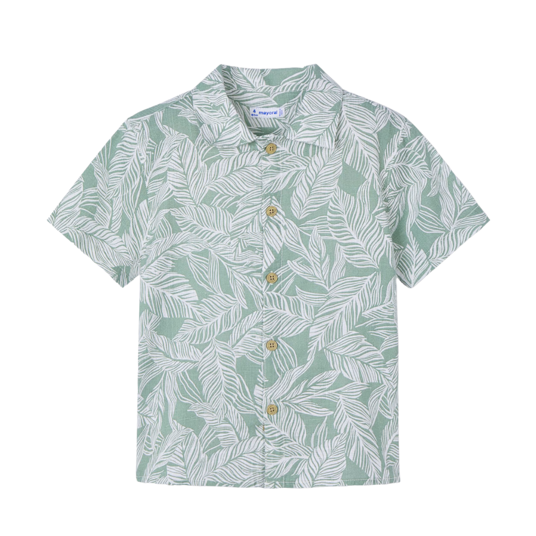 Su diseño incluye detalles frescos como estampado de hojas y palmas cuello clásico y botones frontales para un look casual pero estilizado.