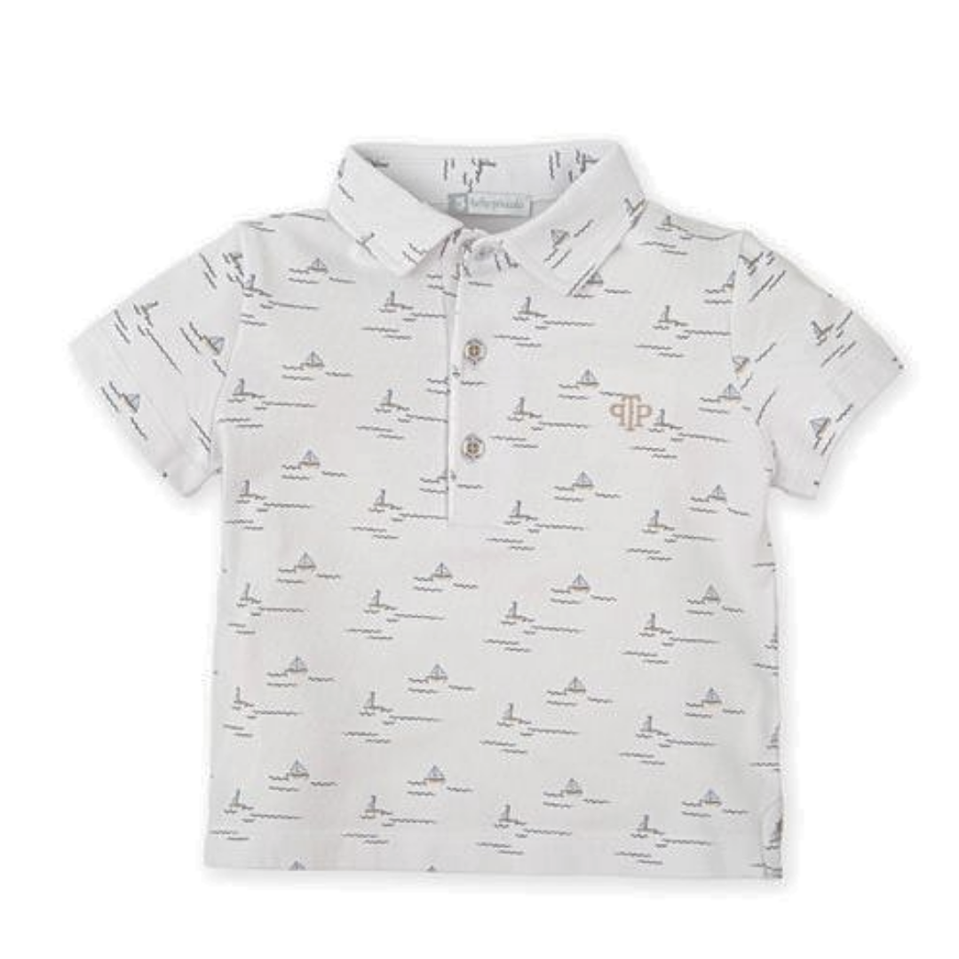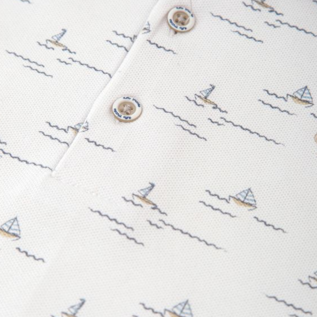 Tipo polo blanca para niño, confeccionada en tela suave y cómoda. Presenta un divertido diseño de barcos que aporta un toque marinero y fresco al look. Ideal para usar en climas cálidos o salidas casuales, combinando estilo y confort en una prenda práctica y versátil.